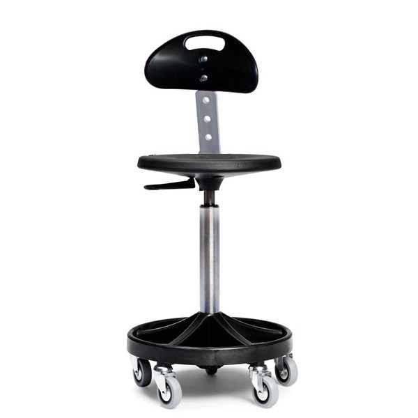 Underredet har fem praktiska fack där du kan förvara verktyg och smådelar – perfekt för effektivt arbete utan att behöva resa dig hela tiden. Den runda sitsen i PU-skum är både bekväm och tålig mot smuts, vätskor och slitage, vilket gör den idealisk i verkstadsmiljöer.