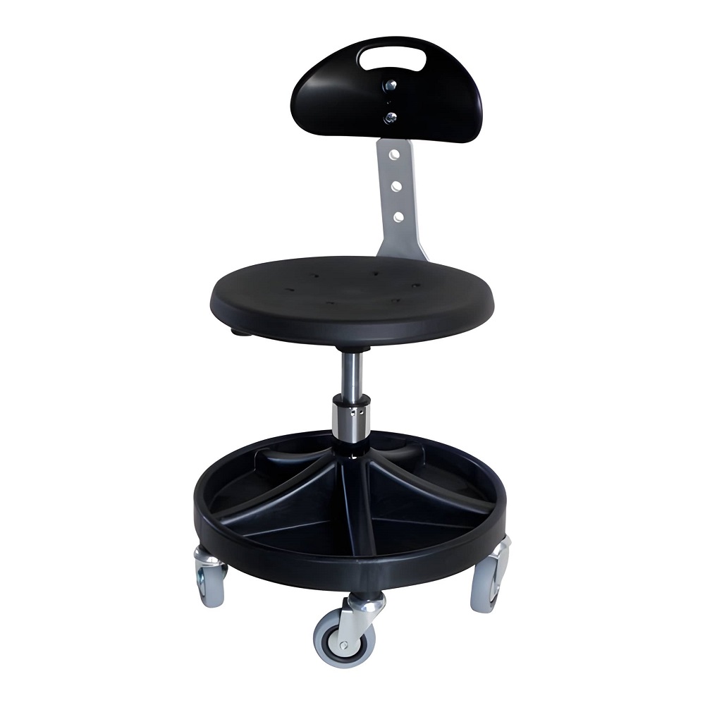 Underredet har fem praktiska fack där du kan förvara verktyg och smådelar – perfekt för effektivt arbete utan att behöva resa dig hela tiden. Den runda sitsen i PU-skum är både bekväm och tålig mot smuts, vätskor och slitage, vilket gör den idealisk i verkstadsmiljöer.