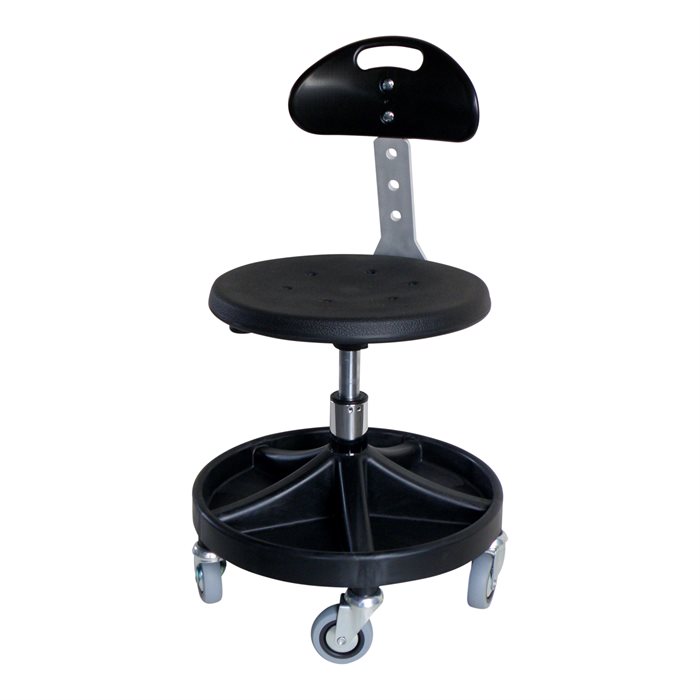 Ergonomisk åkstol med ryggstöd och sitthöjd 470–650 mm. Utrustad med PU-sits, förvaringsfack och stabila hjul – perfekt för verkstad, montage och servicearbete.