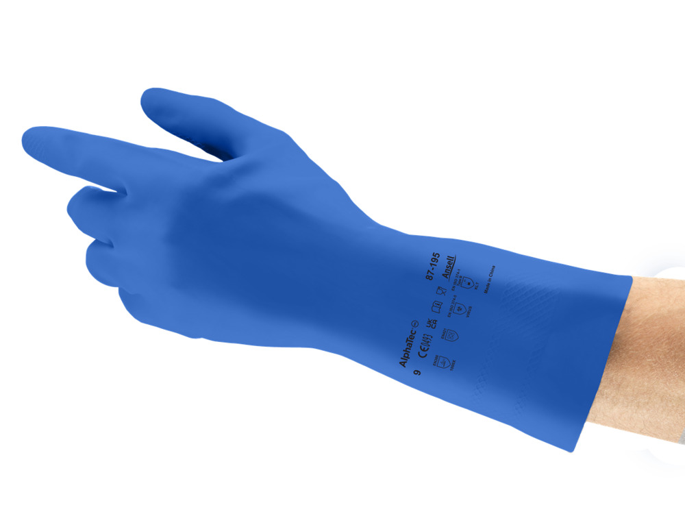 AlphaTec 87-195 från Ansell är en lätt och smidig kemskyddshandske i latex med bomullsfoder. Ger pålitligt skydd mot syror, alkoholer och kemikalier, samtidigt som den erbjuder hög komfort och god fingertoppskänsla. Godkänd för livsmedelshantering.