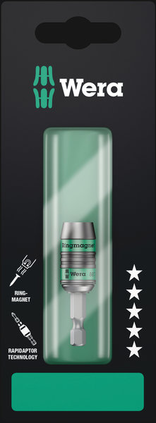 Fattning: För bits med 1/4″ sexkantsfattning enligt DIN ISO 1173-C 6,3 och E 6,3 och Wera-fäste serie 1 och 4 Utförande: Rapidaptor-teknik med rapid-in-, rapid-out-, rapid-spin-, chuck-all- och single-hand-funktion, med ringmagnet och anslagshylsa för säker fasthållning av skruven på klingan Fattning: 1/4″ sexkant, för skruvdragare med fattning enligt DIN ISO 1173-F 6,3