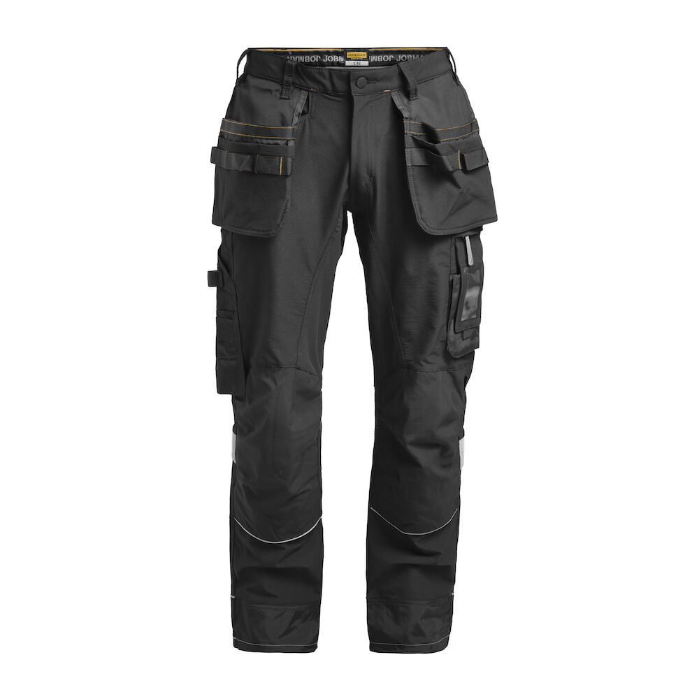 Jobmans hantverksbyxa i stretch är både flexibel och slitstark, tillverkad i 4-vägs stretch med ripstop-material. Rymliga hölsterfickor med extra fack kan stoppas ner i framfickorna. Silikonband i linningen håller byxan på plats, och en förstärkt grenkil i stretch-Cordura ger bättre rörlighet. Bakfickorna är frihängande för enkel åtkomst. Byxan har även hammarhank, tumstocksficka med knivhållare, benficka med blixtlås, ID-kortsfack och telefonfack. Förböjda knän med knäskyddsfickor i Cordura® och reflexpasspoaler. Mesh i knävecken för ventilation och förstärkta benslut i polyamid. Reflexpasspoal och dragsko i benslut.