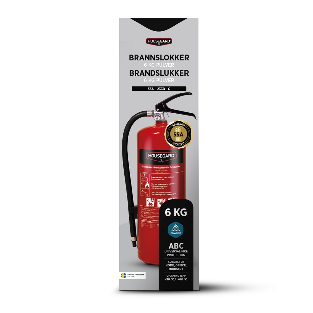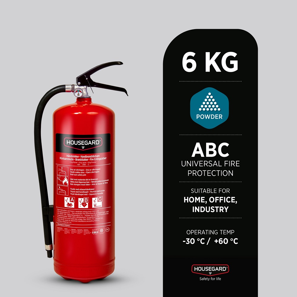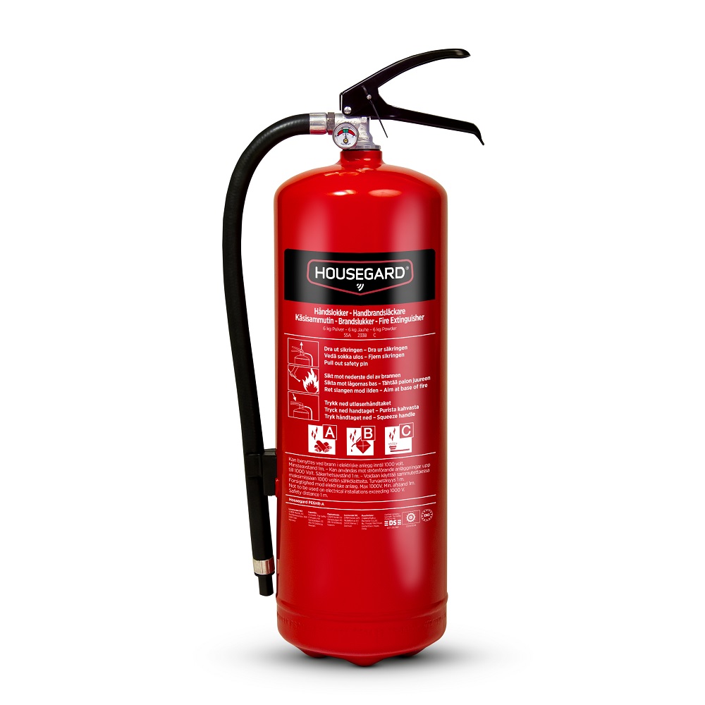 Pulversläckare 6kg PE6HR-A från Housegard är ett tryggt val för både hem och professionella miljöer. Det effektiva ABC-pulvret släcker bränder i material som trä, papper och textilier, samt brandfarliga vätskor och kemikalier. Den är även säker att använda vid elektriska bränder upp till 1000 volt (med minst 1 meters säkerhetsavstånd).