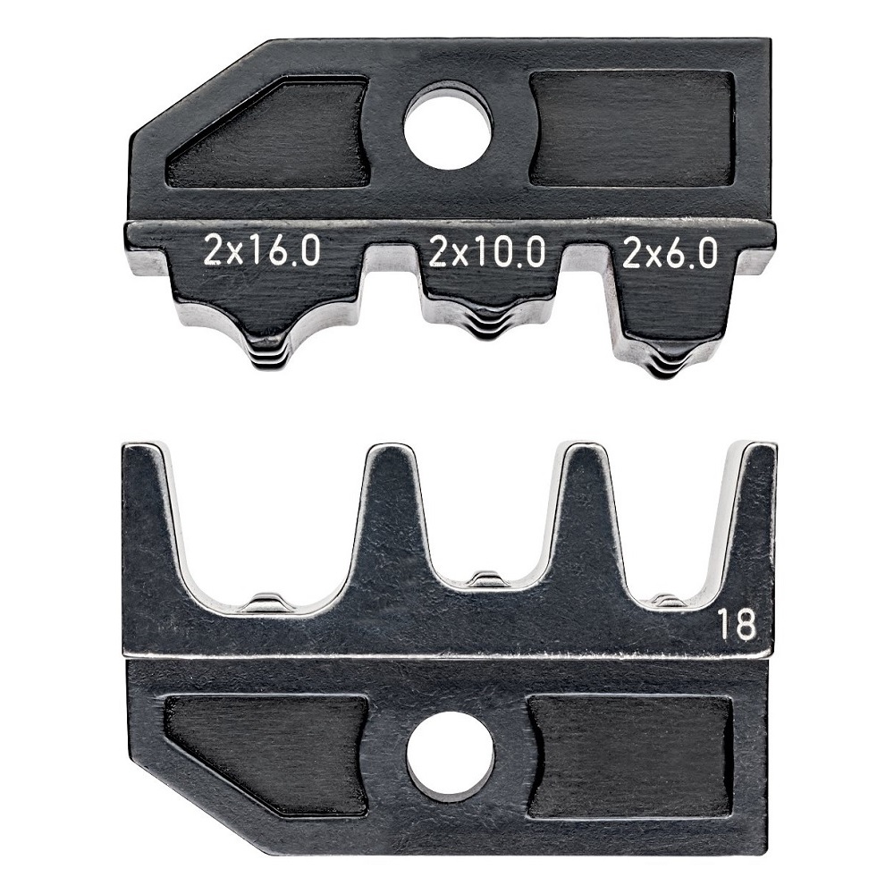 Käftar för crimp-systemtång, avsedda för twin-ändhylsor. Ger godkänd pressning enligt UL i kombination med KNIPEX ändhylsor. Passar ledarstorlekar 2 x 6, 2 x 10 och 2 x 16 mm².
