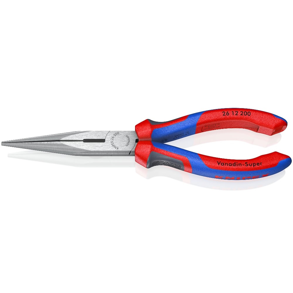 Spetstång med flata och runda käftar samt integrerat skär för precisionsarbete. De långa, spetsiga käftarna (storknäbb) ger hög kontroll vid finare grip- och klipparbeten. Utrustad med induktionshärdade skär (ca 61 HRC) för mjuk, medelhård och hård tråd samt ergonomiska komfortgrepp med KNIPEXtend-gränssnitt.