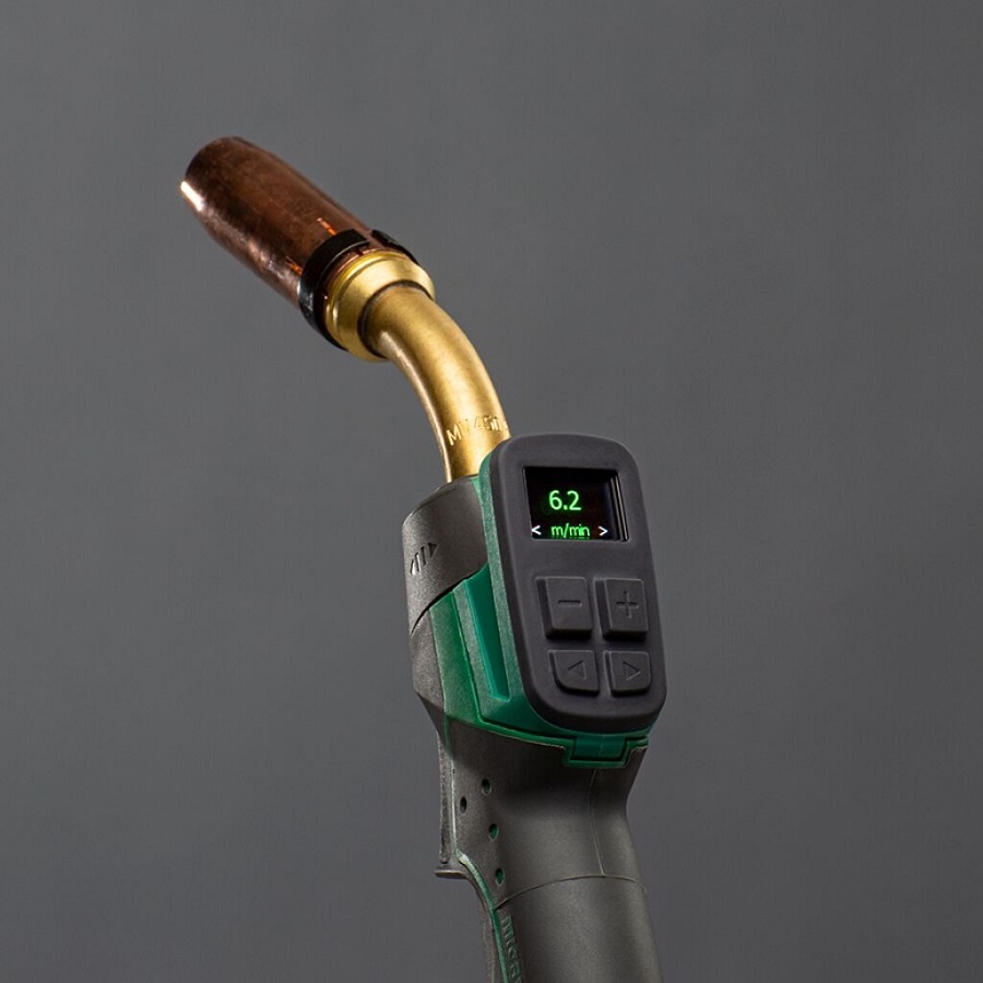 Migatronic Grafisk Smart Torch modul med 4 knappar. Justera funktioner som trådmatningshastighet, svetsström, spänning, bågjustering och sekvens direkt från brännarhandtaget. Passar MIG-A Twist®-brännare tillsammans med Sigma Select och Automig 300 Pulse med grafisk display. Ger full kontroll över svetsparametrar – ända ner till en ampere.