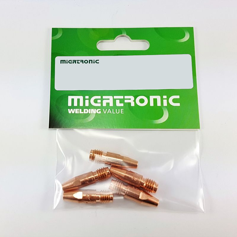 Kontaktrör för Migatronic MIG/MAG-svetspistoler, anpassat för 1,0 mm svetstråd. Tillverkat i slitstark koppar-krom-zirkoniumlegering (CuCrZr) som ger hög värmetålighet, stabil strömöverföring och längre livslängd än standard kopparrör.
