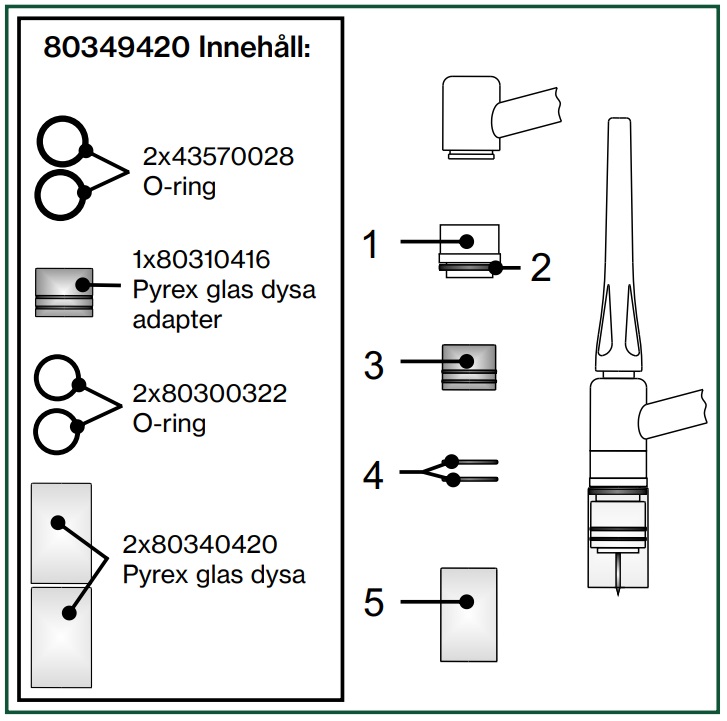2 x glas dysa, 2 x O-ring, 1 x glas dysa adapter, 2 O-ring.