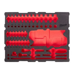 Milwaukee skuminlägg för 67-delars 1/2″ spärrskafts- och bitshylssats PACKOUT. Laserskuret skum med tydliga markeringar som…