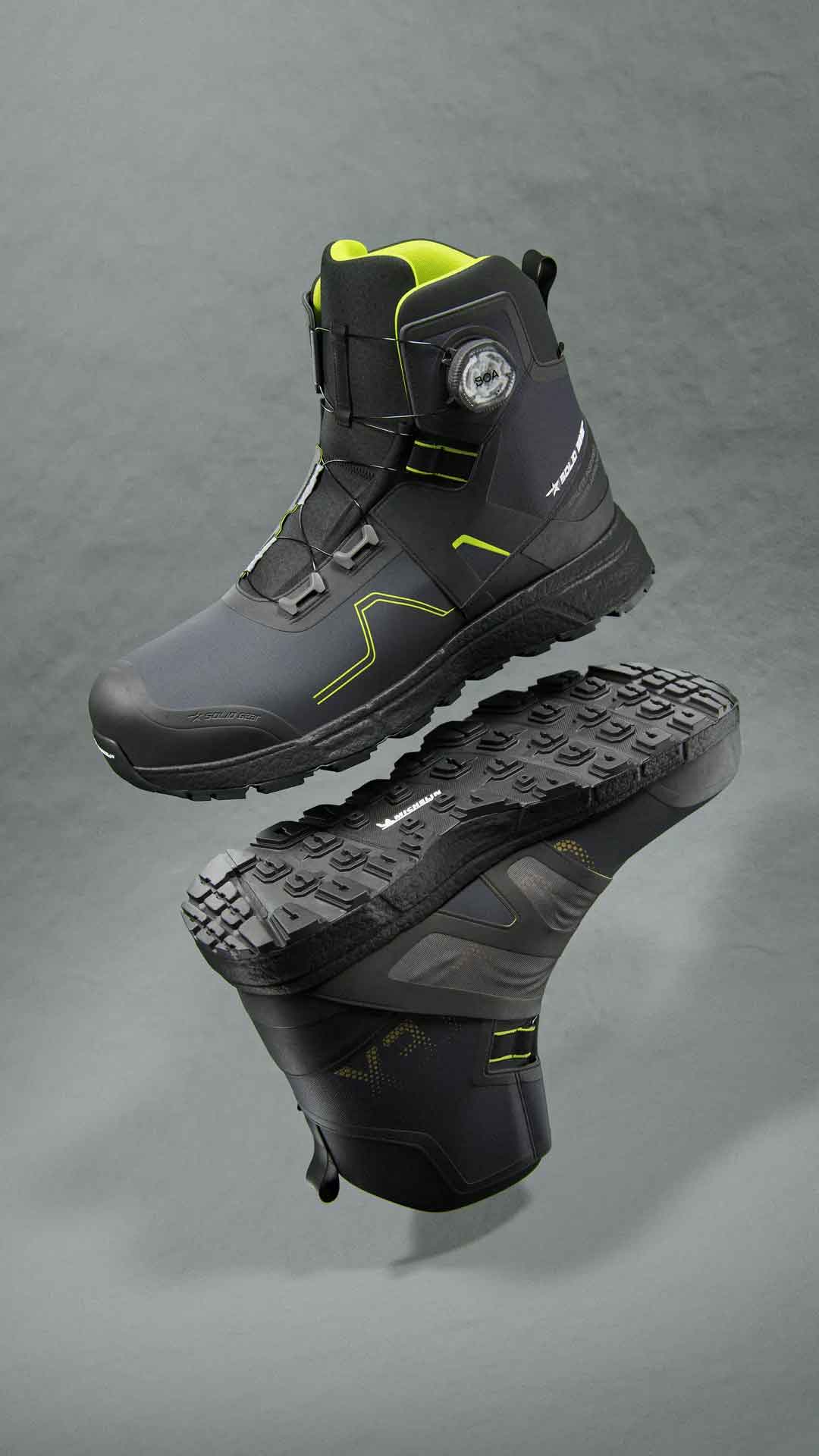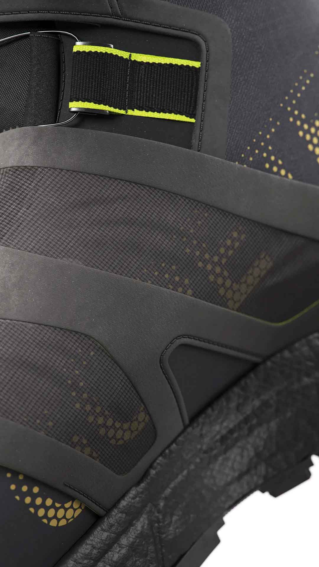 Ovandelen kombinerar slitstarkt läder med tekniska textilmaterial för optimal hållbarhet och låg vikt. Kängan har komposittåhätta och mjukt spiktrampskydd som ger hög skyddsnivå samtidigt som flexibiliteten bibehålls.
