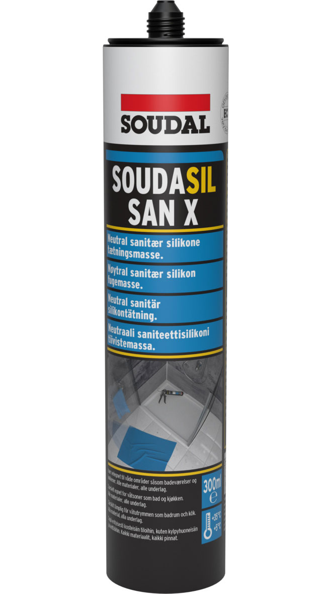 Soudasil SAN X är en högkvalitativ neutralhärdande silikonfogmassa baserad på alkoxisilikon, framtagen för fogning och tätning i såväl bygg- som sanitära applikationer. Fogmassan har utmärkt fuktbeständighet och permanent elasticitet, vilket gör den särskilt lämplig för: