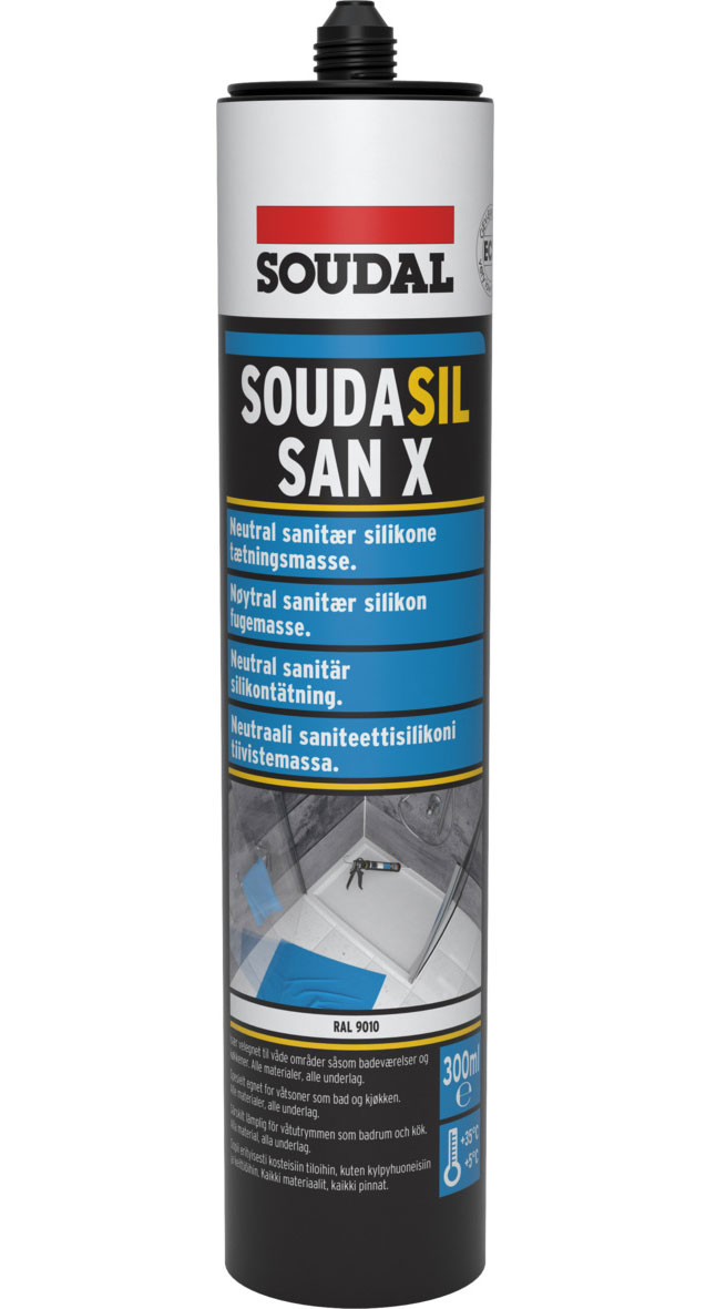 Soudasil SAN X är en högkvalitativ neutralhärdande silikonfogmassa baserad på alkoxisilikon, framtagen för fogning och tätning i såväl bygg- som sanitära applikationer. Fogmassan har utmärkt fuktbeständighet och permanent elasticitet, vilket gör den särskilt lämplig för: