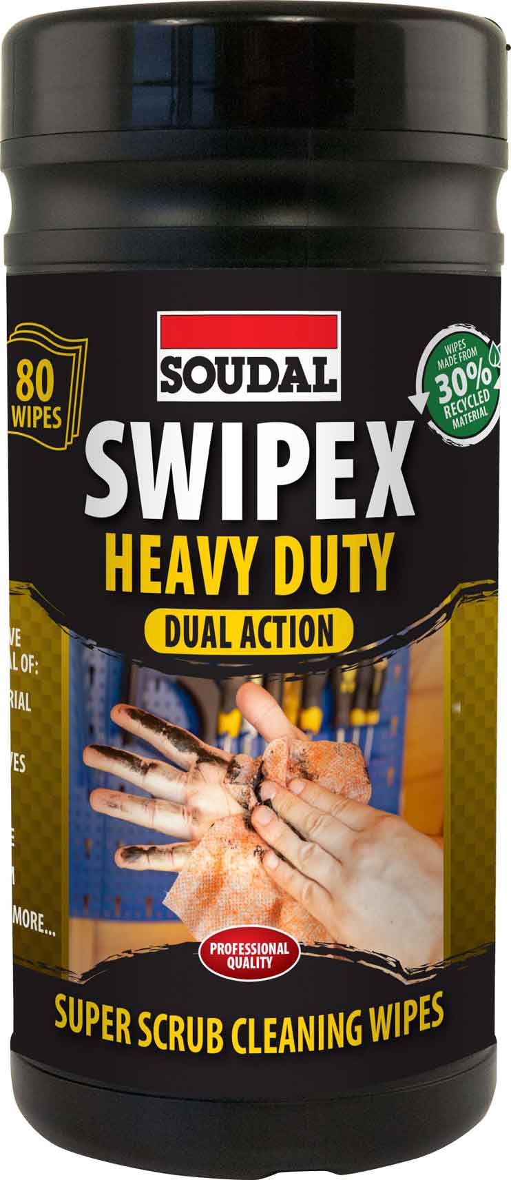Soudal Swipex Heavy Duty är robusta och effektiva rengöringsdukar framtagna för att snabbt avlägsna tuff smuts utan vatten. Perfekt när du arbetar med fogmassa, lim, PU-skum eller olja och behöver få rent direkt.