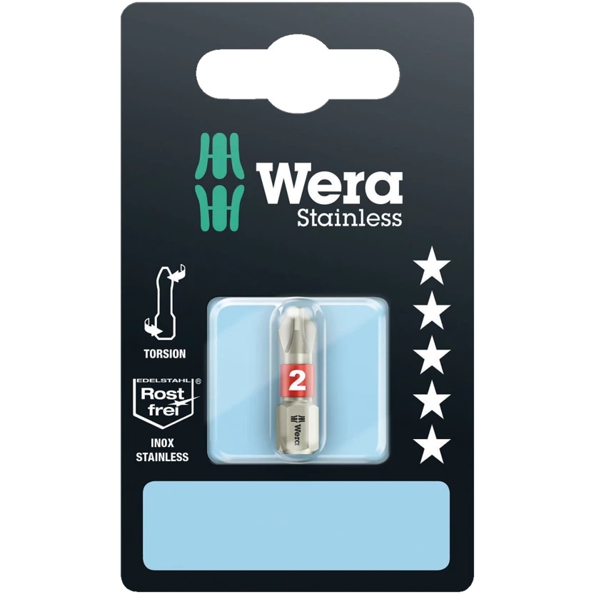 Högkvalitativa bits av rostfritt stål för krysspårsskruvar. Weras verktyg av rostfritt stål är utförda i en materialkvalitet som håller även ful extern rost borta. Med torsionszon: Torsionsbits dämpar momenttoppar i torsionszonen. Förtida förslitning förebyggs och bitsens livslängd ökar. 1/4″ sexkant, för hållare enligt DIN ISO 1173-D 6,3.