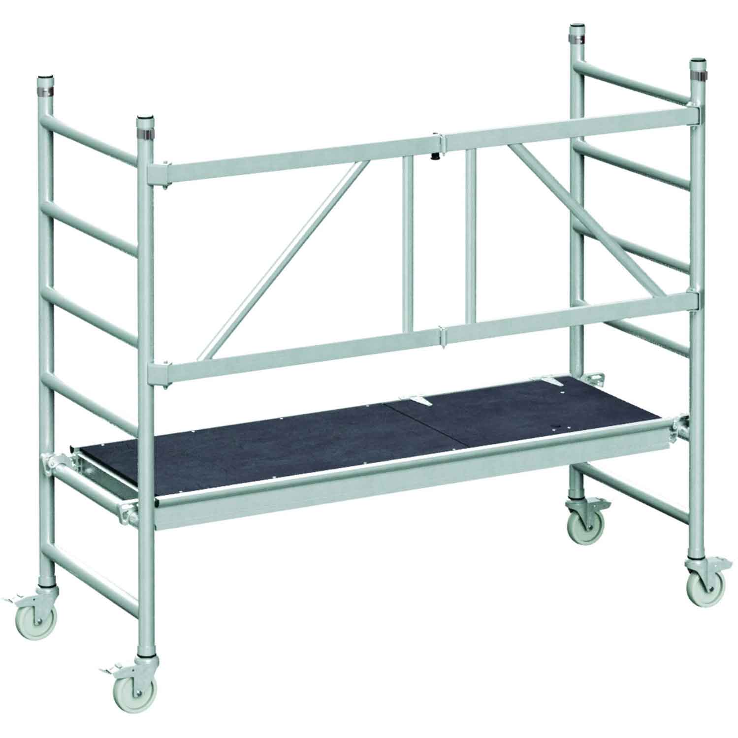 Det unika toe board-systemet (sparklist) är patenterat och fungerar utan klämmor — vilket minskar risken att förlora delar. De robusta, släta styrtapparna i plast förhindrar att ramdelarna tippar vid montering. Ställningen är designad enligt EN 1004 klass 3, vilket innebär en belastning upp till 200 kg/m², och har 125 mm svängbara länkhjul med broms — med möjlighet till höjdjustering via adapter.
