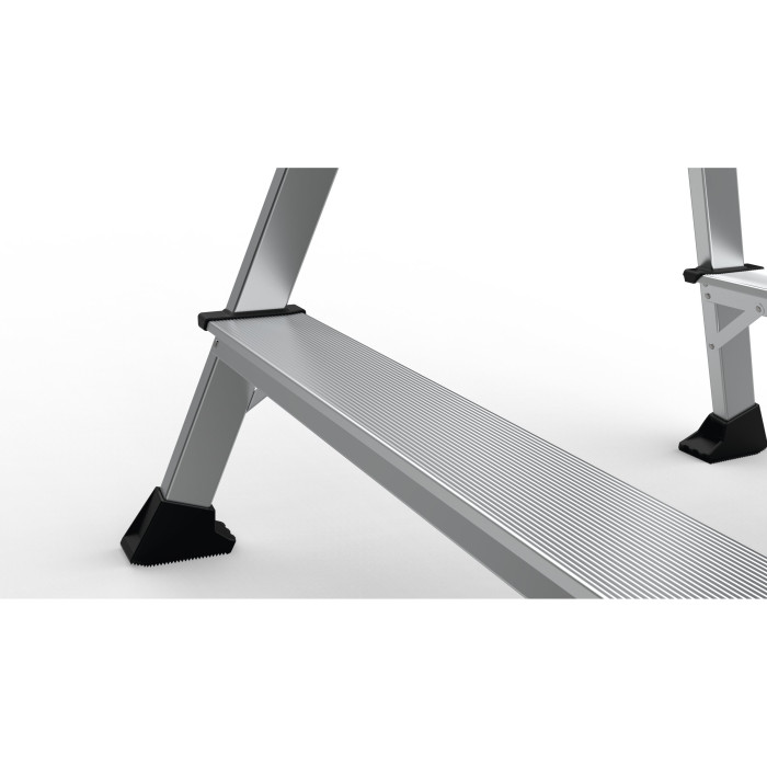 De extra djupa stegen (92 mm) gör uppstigningen säker och bekväm, samtidigt som den dubbelsidiga designen med fasta stag ger maximal stabilitet. Du kan kliva upp från båda sidor – smidigt och praktiskt vid arbete i trånga utrymmen.